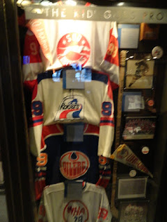 Afterwards, Rob and I went to Wayne Gretzky's restaurant for lunch. Here is his uniform and torch from the Olympic Torch relay and Olympic opening ceremonies in 2010 |
